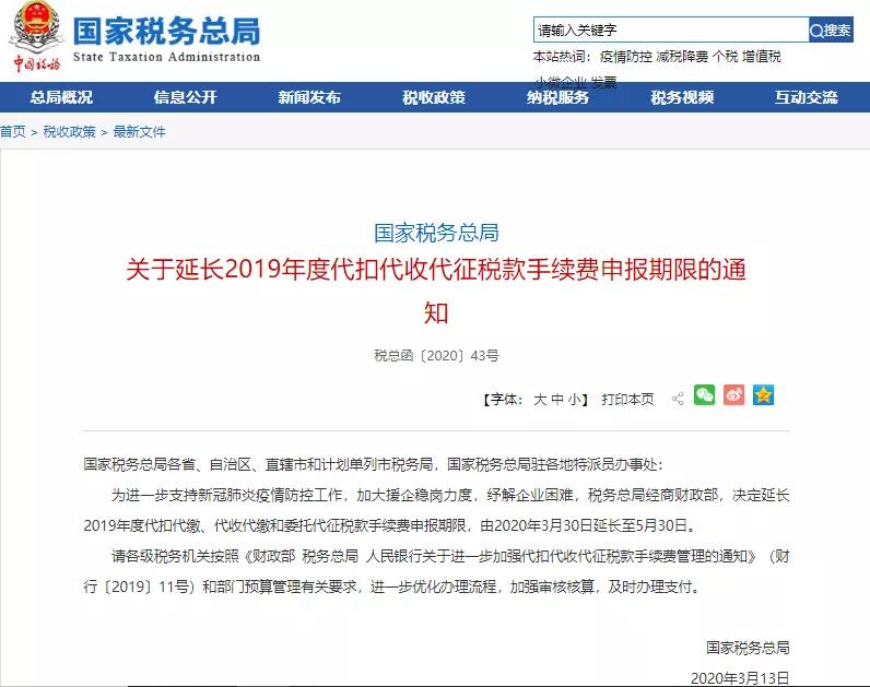 《國(guó)家稅務(wù)總局關(guān)于延長(zhǎng)2019年度代扣代收代征稅款手續(xù)費(fèi)申報(bào)期限的通知》(稅總函〔2020〕43號(hào))宣布,決定延長(zhǎng)2019年度代扣代繳、代收代繳和委托代征稅款手續(xù)費(fèi)申報(bào)期限,由2020年3月30日延長(zhǎng)至5月30日。