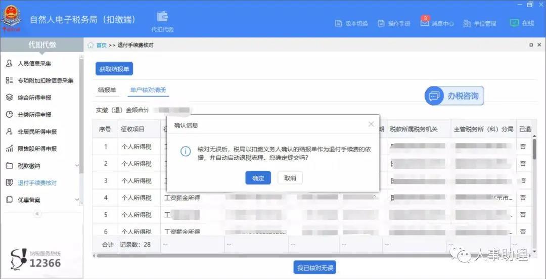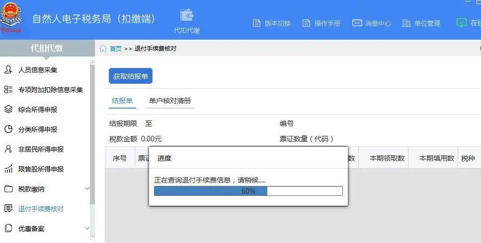 第三步:等待系統(tǒng)自動(dòng)查詢(xún)出退付手續(xù)費(fèi)信息后核對(duì)數(shù)據(jù)是否準(zhǔn)確,具體數(shù)據(jù)可與查詢(xún)統(tǒng)計(jì)-單位申報(bào)記錄查詢(xún)中的申報(bào)信息進(jìn)行詳細(xì)核對(duì),核對(duì)時(shí)需注意稅款所屬期和實(shí)際入庫(kù)期問(wèn)題。
