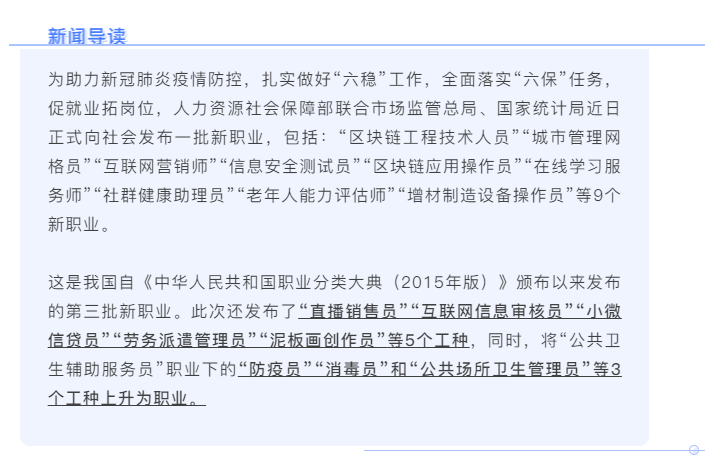 此批新職業(yè)是由人力資源社會(huì)保障部向社會(huì)公開(kāi)征集,組織職業(yè)分類(lèi)專(zhuān)家嚴(yán)格按照職業(yè)分類(lèi)原則、標(biāo)準(zhǔn)和程序進(jìn)行評(píng)估論證,并通過(guò)網(wǎng)絡(luò)媒體等向社會(huì)公示后確定的。此批新職業(yè)主要涉及預(yù)防和處置突發(fā)公共衛(wèi)生事件領(lǐng)域、適應(yīng)高校畢業(yè)生就業(yè)創(chuàng)業(yè)需要的新業(yè)態(tài)領(lǐng)域,以及適應(yīng)貧困勞動(dòng)力和農(nóng)村轉(zhuǎn)移就業(yè)勞動(dòng)者等需要的促進(jìn)脫貧攻堅(jiān)領(lǐng)域,具有以下幾個(gè)特點(diǎn):