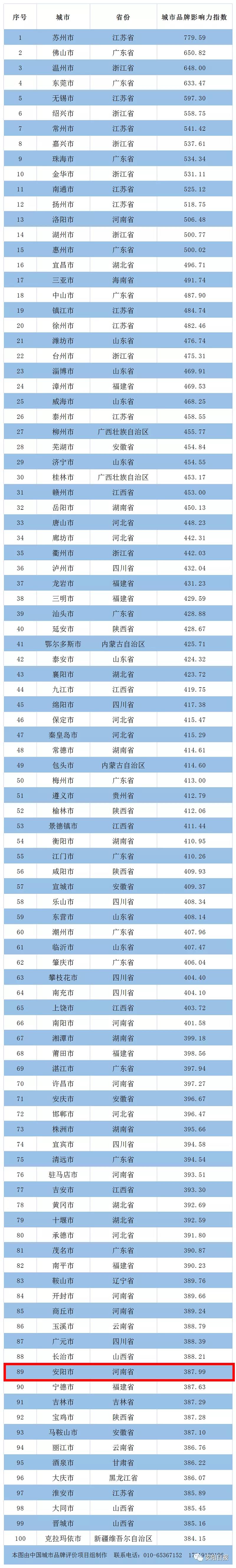 5月9日上午由新華社、中國品牌建設(shè)促進(jìn)會、國務(wù)院國資委新聞中心指導(dǎo)等單位主辦的2021中國品牌價值信息發(fā)布暨中國品牌建設(shè)高峰論壇在上海舉行,會上發(fā)布了中國地級市品牌綜合影響力指數(shù)前100名城市名單,安陽首次進(jìn)入榜單,位列第89名。