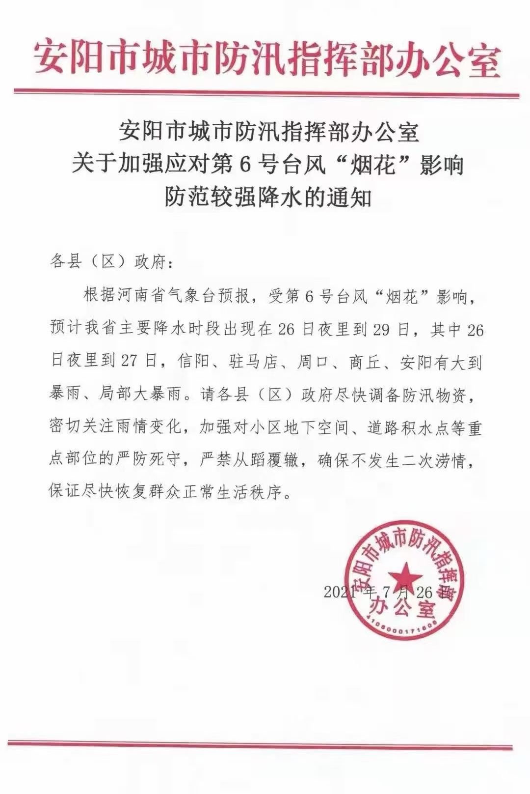 安陽市城市防汛指揮部辦公室關(guān)于加強應(yīng)對第6號臺風(fēng)“煙花”影響防范較強降水的通知