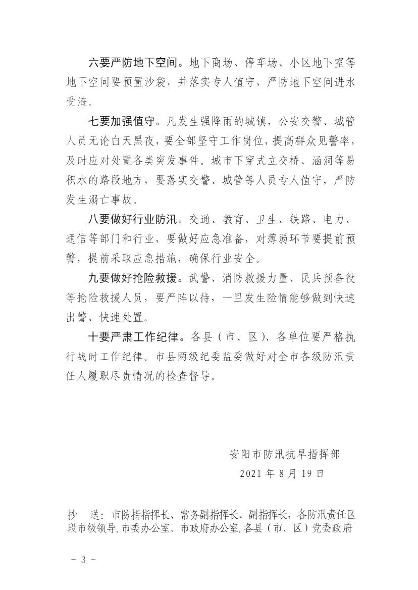 就做好當(dāng)前防汛工作,安陽(yáng)市防汛抗旱指揮部2021年8月19日發(fā)布緊急通知,要求嚴(yán)格落實(shí)責(zé)任、加強(qiáng)會(huì)商預(yù)警、組織好人員轉(zhuǎn)移避險(xiǎn)、排查危房住人、對(duì)水毀工程采取緊急度汛措施、嚴(yán)防地下空間、加強(qiáng)值守、做好行業(yè)防汛、做好搶險(xiǎn)救援、嚴(yán)肅工作紀(jì)律。